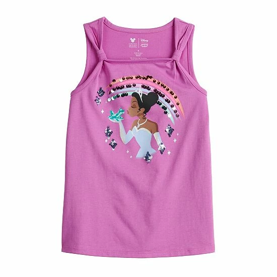 She’ll love adding a touch of sparkle to her warm weather wardrobe with this girls’ embellished, knot-shoulder The Princess and the Frog graphic tank top from Jumping Beans. ©Disney