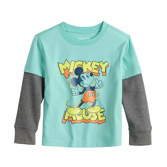 Your little skater boy will look just adorable in this toddler boys’ Mickey Mouse faux layered sleeve skater tee from Jumping Beans. ©Disney