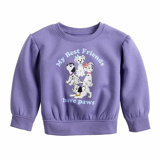 Your little lady will be comfy, cozy, and cute in this toddler girls’ puff sleeve fleece 101 Dalmatians sweatshirt from Jumping Beans. ©Disney